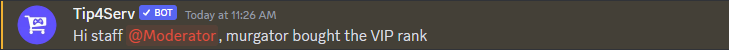 `Hi staff` [`<@&role_id>`](#user-content-fn-2)[^2]`, {discord_username} bought the VIP rank`