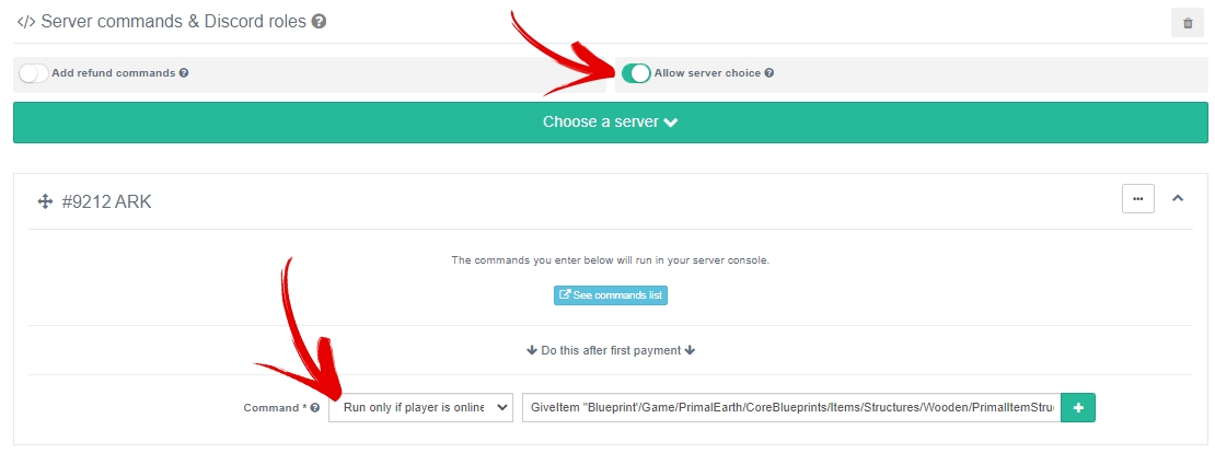 • Enable “Allow server choice” and “Run only if player is online” in the product settings.